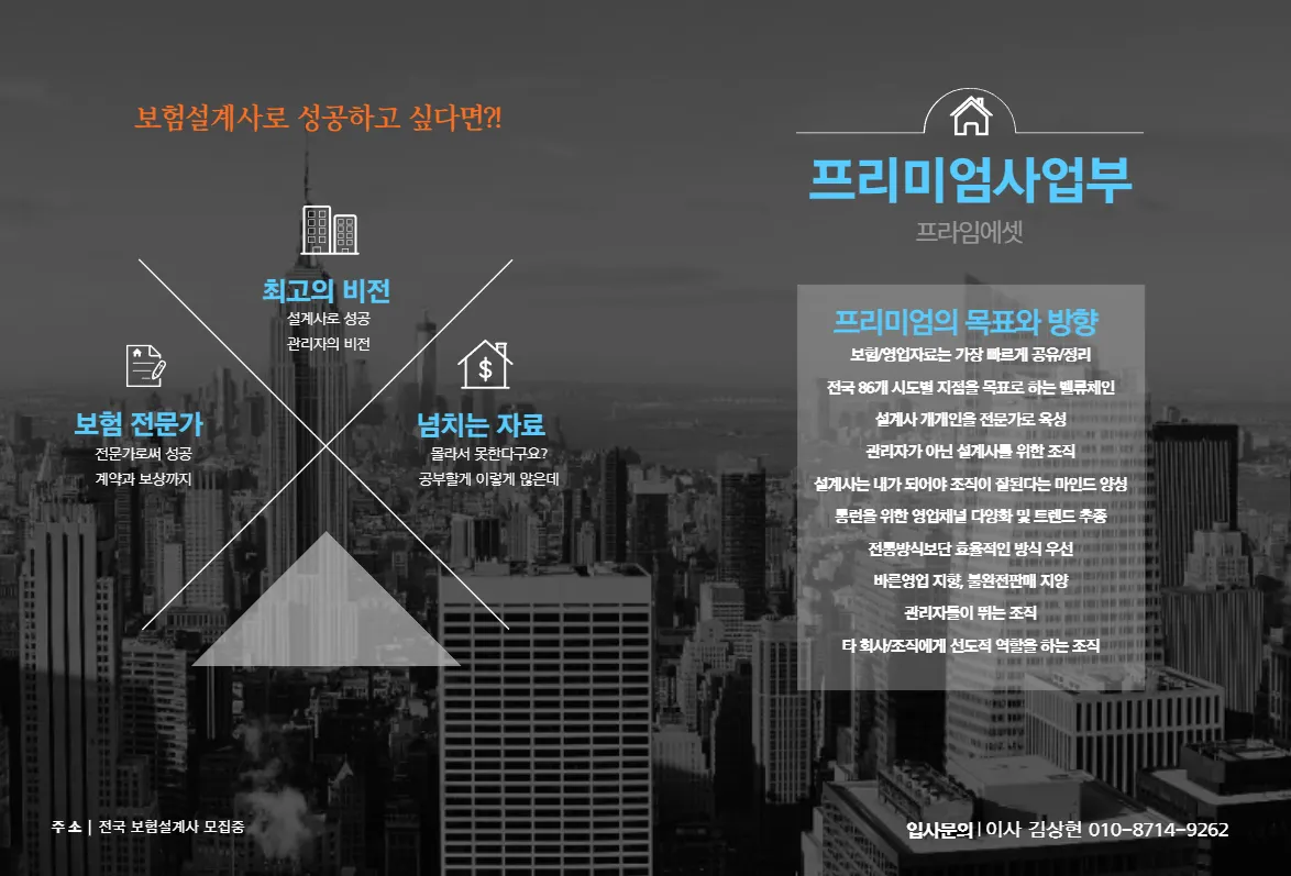 프리미엄사업부는 프라임에셋 188본부를 시작으로 파생된 16개본부 연합의 브랜드입니다.